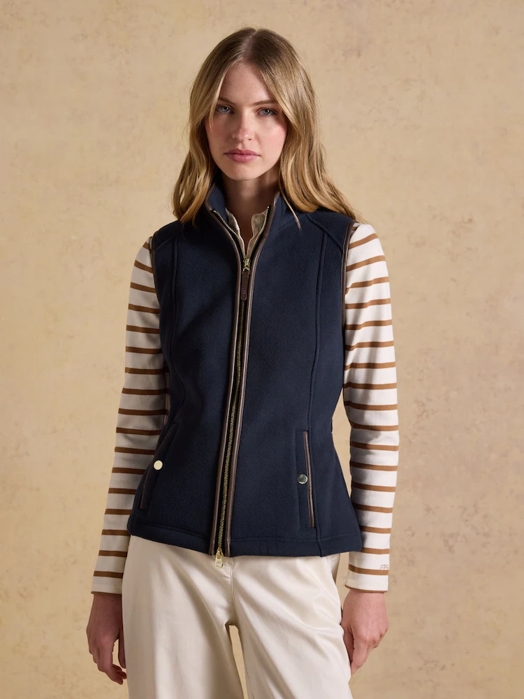 Our new countryside Heritage gilet has been developed to elevate your wardrobe. Crafted from luxury polar fleece to a classic profile with an internal waist adjuster to sculpt your silhouette, it’s topped with a practical zip fastening that leads to its warming stand collar. With stylish contrast faux leather trims, popper pockets, our classic Joules embroidery at the back neck, and signature engraved hardware to finish, it’s bound to be an item you’ll continue to reach for. Perfect for layering or as a standalone piece think a stroll in the park, running errands, or even for a day out, our Heritage gilet has got you covered.